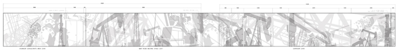 An oilfield motif adorns the glass office partitions and walls of Teine Energy. Translucent graphic shapes on frosted glass creates an open airy space, but still provides privacy. The abstracted shapes take on monumental form representing the strength and velocity of the oil and gas business.