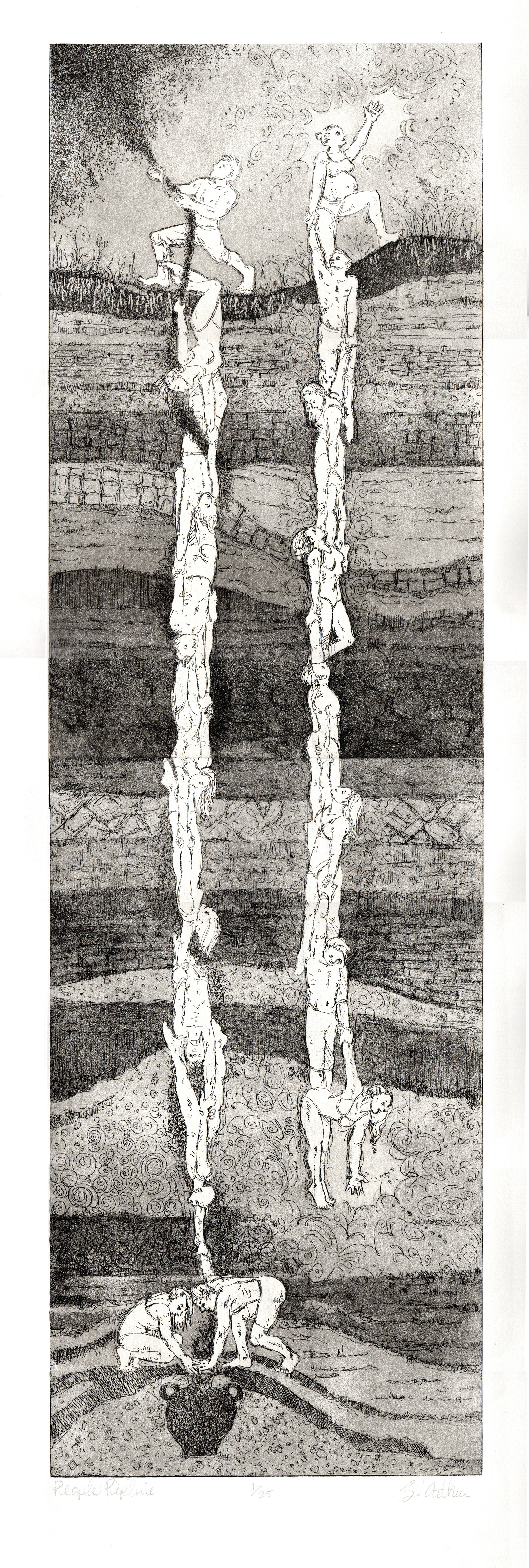 This etching is an imaginary cross-section of the earth's underground rock layers, showing how depleted oil and gas infrastructure and geological formations are being used to support new energy advancements. Linked human figures depict a pipeline of CO2 being sequestered (CCS) deep into the earth, while another chain of figures symbolically gathers Geothermal Energy from the earth's sub-terrestrial strata, bringing it up to the surface. The “People Pipeline” is a metaphor of humanity working together, hand in hand, to make positive changes for the future.